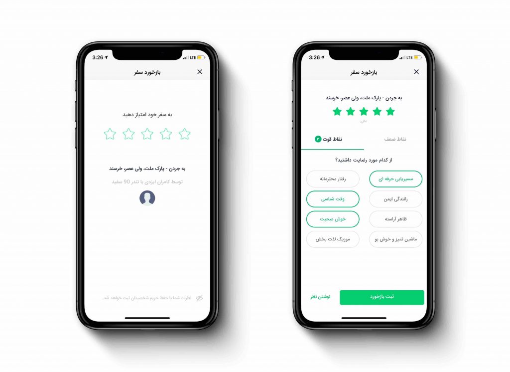در انتهای سفر هم می‌توانید بر اساس تجربه سفر، از یک (کمترین) تا ۵ ستاره (بیشترین) به کاربر راننده اسنپ امتیاز دهید تا ما را در حفظ و ارتقای کیفیت سفر یاری کنید.
