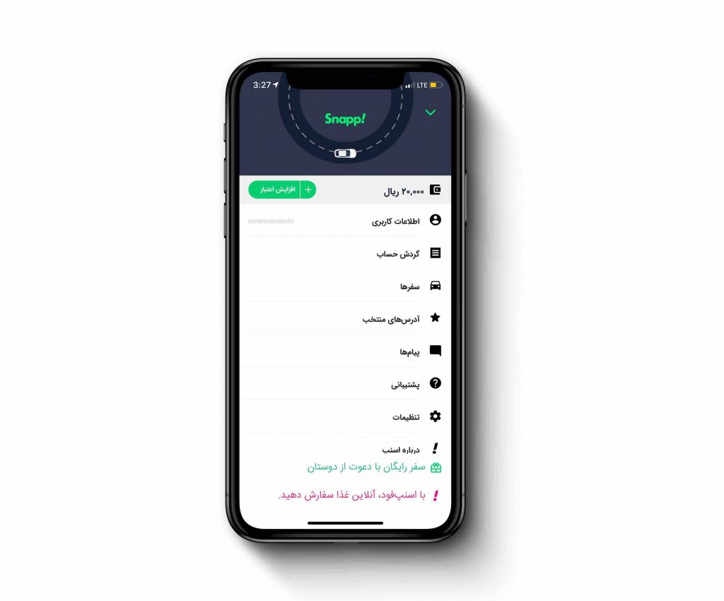 با انتخاب آیکون سه خط موازی در گوشه بالا سمت راست صفحه، به منوی اصلی اسنپ دسترسی پیدا می‌کنید. در این قسمت نام و موجودی اعتبار اسنپی خود را به همراه موارد زیر مشاهده خواهید کرد: