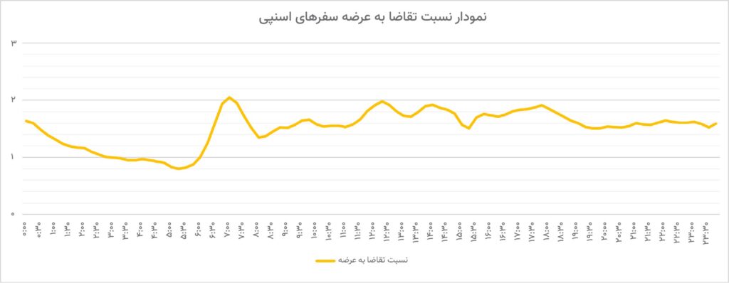 نمودار نسبت تقاضا به عرضهی سفرهای اسنپ در ۱۰ شهر پرترافیک کشور، که نشان میدهد بیشترین میزان تقاضا در ساعت ۷ صبح، ۱۲:۳۰ بعدازظهر و بازهی زمانی ۱۶:۳۰ تا ۱۹ عصر ثبت شده است.
