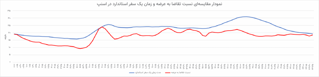 تحلیل نسبت تقاضا به عرضه نشان میدهد که مانند سال گذشته، نرخ تقاضا در ساعات ابتدایی روز سریعتر از عصر افزایش مییابد، اما در ساعتهای پرتردد عصر مدتزمان صرف شده در ترافیک بیشتر است. به این معنی که عامل اصلی نوسان قیمتی سفرها در ساعات صبح به نسبت تقاضا به عرضه و در ساعات عصر بیشتر به حجم بالای ترافیک برمیگردد.
